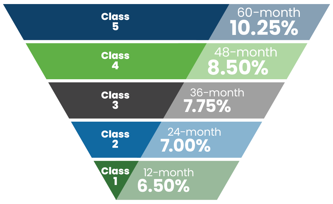Five Fixed Rate Options and Term Choices: Promissory note classes offer stated annual interest rates of up to 10.25%, depending on the selected term.(5) Investors can place all or a portion of the initial investment into one or more classes.
